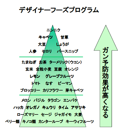 デザイナーフーズプログラムは、1990年から5年間の計画で、予算2000万ドルで始まったアメリカ国立ガン研究所のプロジェクトの名称です。ガンによる死亡を減らし、ガンを予防することが目的です。発ガンの原因の1/3以上は食生活に由来すると考えられています。カロリー高脂肪の食事よりも野菜や穀物中心の食生活のほうが、癌の予防効果が高いことがわかりました。このプログラムでは、過去10年間に「ガン予防」という統計上の効果が認められた食品を発表しました。発表された約40種類の食品はいずれも抗酸化作用があり、活性酸素などによるDNAの損傷を防いでガンを抑制することが証明されている食品です。デザイナーフーズ・プログラムの中心人物カラゲイ博士によれば、ピラミッドの頂点にある食品が効果が高いといわれています。上から3つのグループに分けられ、上部には、抗酸化作用の高いβカロテンやポリフェノールなどを含む食品が位置しています。この位置付けは疫学調査に基づいてガンに効く順番に並べられています。これらの食品は、ガン予防だけでなく、免疫力を高め、生活習慣病の予防にも有効です。